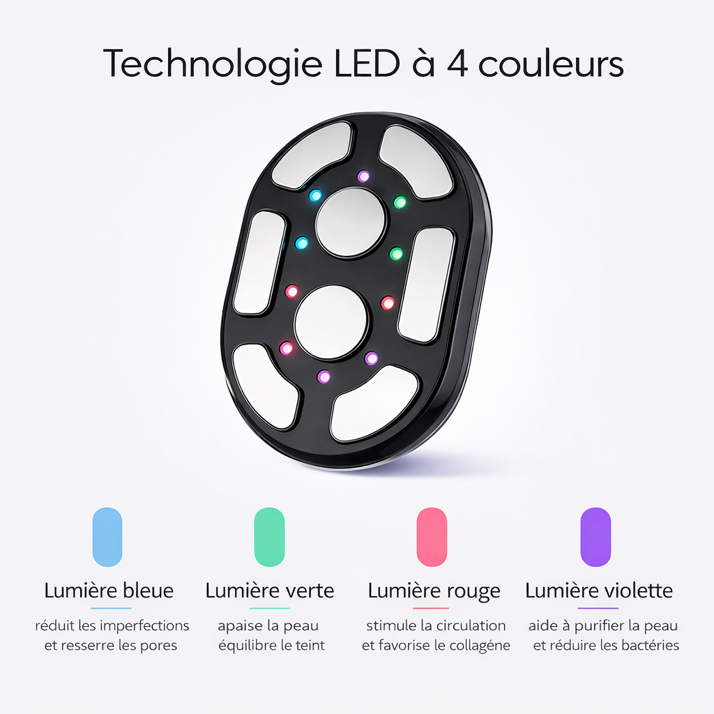 La lumière rouge booste le collagène, réduit les rides. La lumière bleue purifie et équilibre le teint en douceur.
